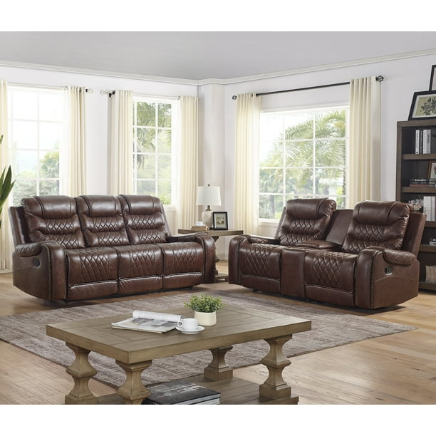 Usually ships within 2 to 3 days. 63l x 41w x 41h. This well designed sofa and loveseat set will upgrade your living decor featuring a rolled arm, genuine leather upholstery and accented with nailheads on the arms and front panel. Myco furniture abbie dark brown leather nailhead air reclining power sofa set 3pcs modern 1010 br 3. This sofa combines clean, classic lines with retro details, like tufted back and seat cushion and tapered legs.